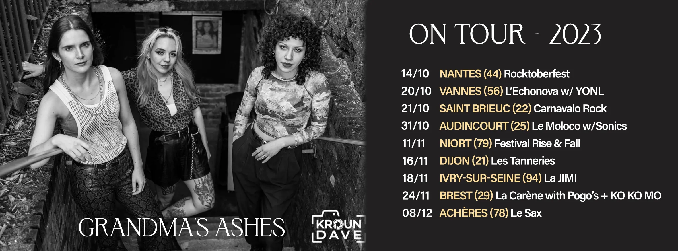 Après avoir rempli la belle salle de la Maroquinerie à Paris pour leur Release Party, et retourné les salles de France durant tout ce début d’année 2023, Grandma’s Ashes enchaîne avec une série de dates pour l’automne :
