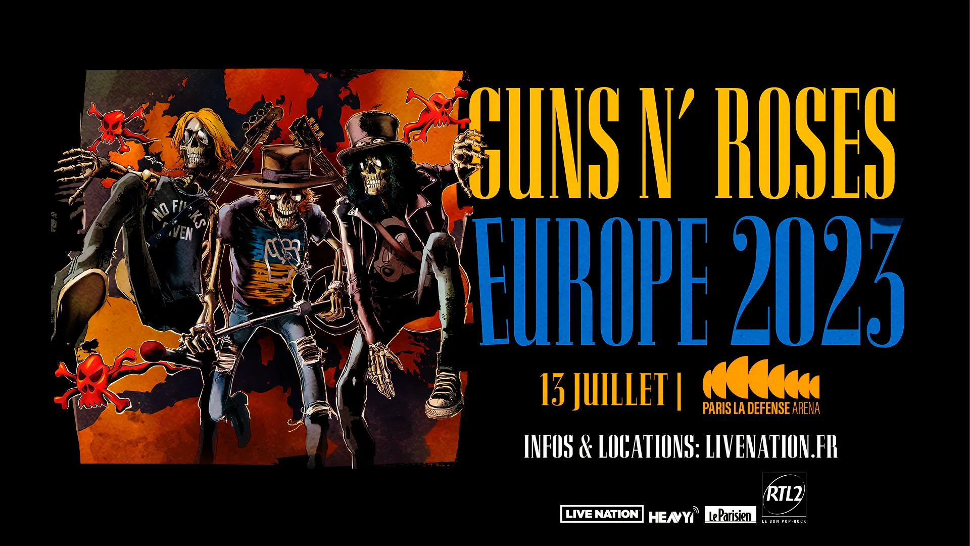 C’est la grande nouvelle du jour : Axl Rose, Duff McKagan, Slash, Dizzy Reed, Richard Fortus, Frank Ferrer, et Melissa Reese poseront leurs amplis à Paris, le 13 juillet dans le cadre de sa tournée mondiale : GN'R 2023 World Tour.