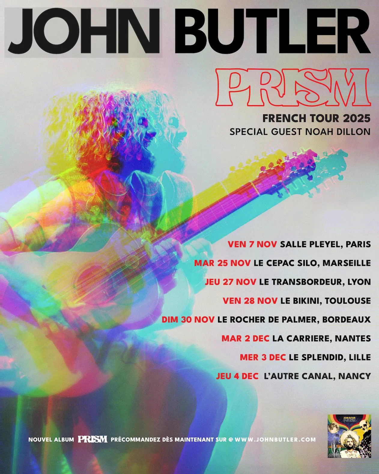 Dès le 25 novembre, il jouera à Marseille, le 27 à Lyon pour rejoindre Toulouse le lendemain. Après quoi, John Butler posera ses amplis le 30 novembre à Bordeaux puis attaquera le mois de décembre par Nantes, le 2. Lille le 3 décembre et la tournée Prism s’achèvera en beauté à Nancy le 4. De belles occasions de laisser tomber la doudoune pour la planche de surf.